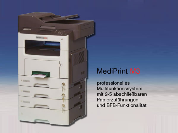 Das BFB-/Multifunktionssystem MediPrintM3 liefert mit einer einzigartigen Kombination für den BFB-Druck und Multifunktionen für Scannen, Faxen und Kopieren eine komplette All-in-one-Lösung. Mit 4 Papierzuführungen, bestehend aus der Stapelzuführung für Formulare im Format DIN A6 sowie 3 abschließbaren Papierzuführungen für 250 Blatt in den wahlfreien Formaten DIN A4, DIN A5 und DIN A6 erfüllt er die Anforderungen aus der BFB-Bedruckung. Die 5. Papierzuführung mit 550 Blatt ist vorgesehen für Kopien und Normalpapier im Format DIN A4. Die hohe Druckgeschwindigkeit (bis 42 Seiten/Min), Duplexdruck, Toner-Kassette für ca. 30.000 Seiten, Belichtungseinheit für ca. 60.000 Seiten, empfohlene monatliche Seitenleistung von 1.500 – 14.000 und der integrierte Scanner (Farbe oder S/W, 19-41 Seiten/Min.) mit automatischem Vorlageeinzug und Wendeautomatik für 50 Seiten machen den MediPrint M3zum zuverlässigen und wirtschaftlichen All-in-one-Komplett-System. Seitenkosten in Höhe von €-Cent 0,96, geprüft im BFB-Druckjob-Mix (Rezept, 3-seitige Arbeitsunfähigkeitsbescheinigung, Überweisung, Verordnung häusliche Krankenpflege)
